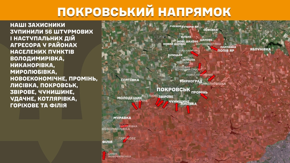 In the Pokrovsk sector, Ukrainian forces stopped 56 assaults near Volodymyrivka, Nikanorivka, Myroliubivka, Novoekonomichne, Promin, Lysivka, Pokrovsk, Zvirove, Chunishyne, Udachne, Kotliarivka, Horikhove, and Filiia.